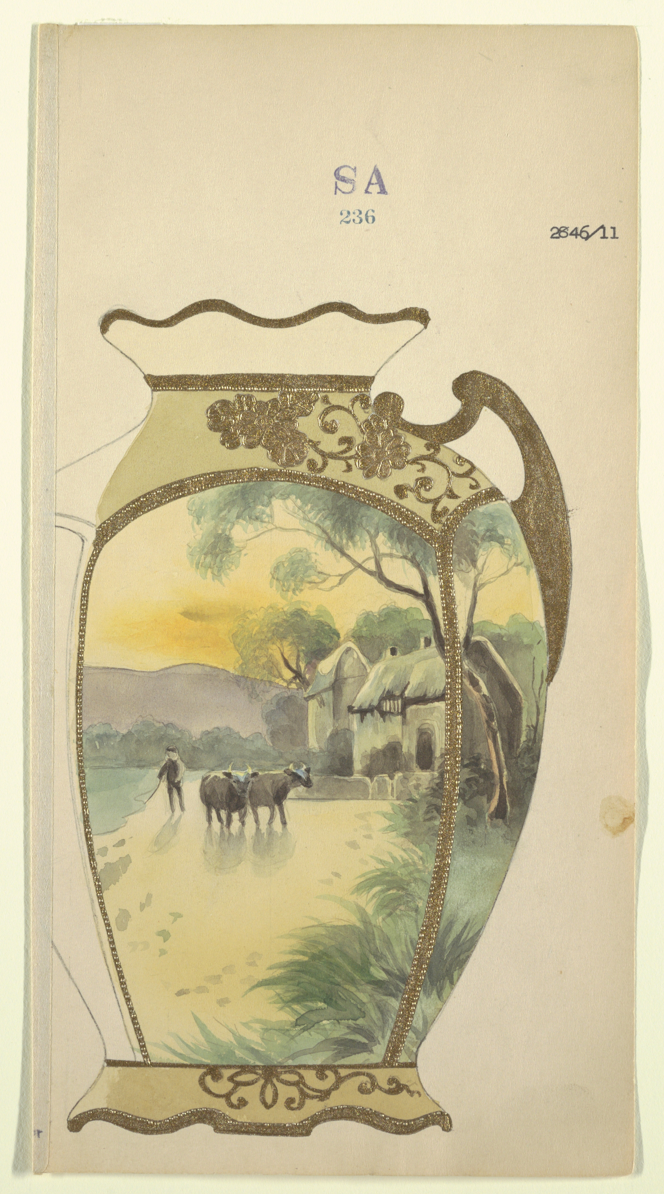 Drawing, Design for a Jug; Made for Noritake; Japan; brush and watercolor, gold gouache, graphite on cream paper; 29.2 x 15.2 cm (11 1/2 x 6 in.) Mat: 35.7 x 45.8 cm (14 1/16 x 18 1/16 in.); 1985-14-54