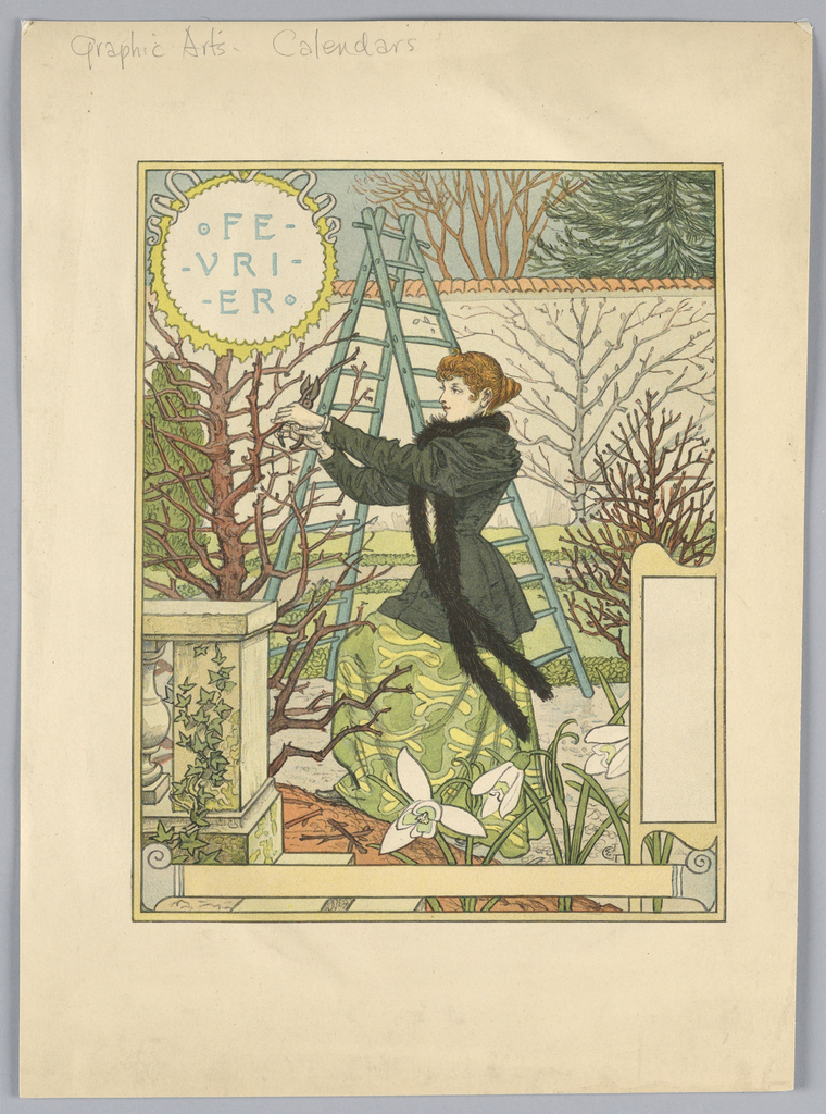 Print, February, from La Belle Jardinière; Designed by Eugène Samuel Grasset (Swiss, 1841 – 1917; active Paris, France 1871–1917); France; chromotypograph; H x W: 27.8 x 20.5 cm (10 15/16 x 8 1/16 in.); Gift of Unknown Donor; 1985-28-1-2
