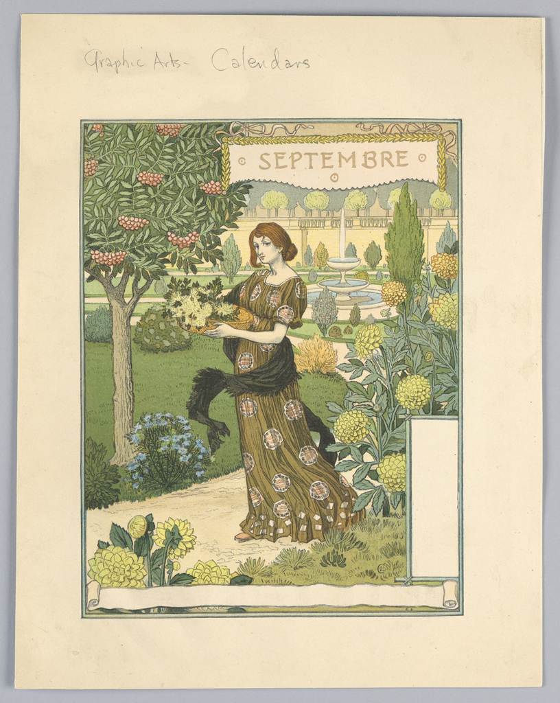 Print, September, from La Belle Jardinière; Designed by Eugène Samuel Grasset (Swiss, 1841 – 1917; active Paris, France 1871–1917); France; chromotypograph; H x W: 27.8 x 20.5 cm (10 15/16 x 8 1/16 in.); Gift of Unknown Donor; 1985-28-1-5