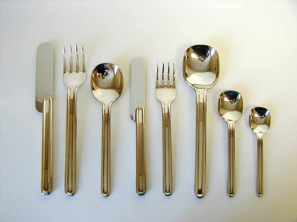 This is a knife. It was designed by Lella Vignelli and Massimo Vignelli and design team member: David Law and manufactured by Calegaro Argenteria. It is dated 1979 and we acquired it in 1985. Its medium is silver plated, metal. It is a part of the Product Design and Decorative Arts department.