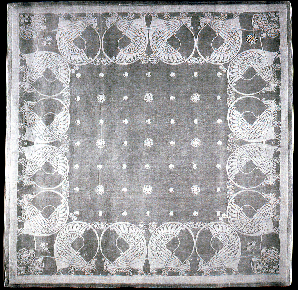 This is a Napkin. It was designed by Chris Lebeau and manufactured by E.F.J. Van Dissel and Son. It is dated ca. 1906 and we acquired it in 1985. Its medium is linen and its technique is 7&1 satin damask. It is a part of the Textiles department.