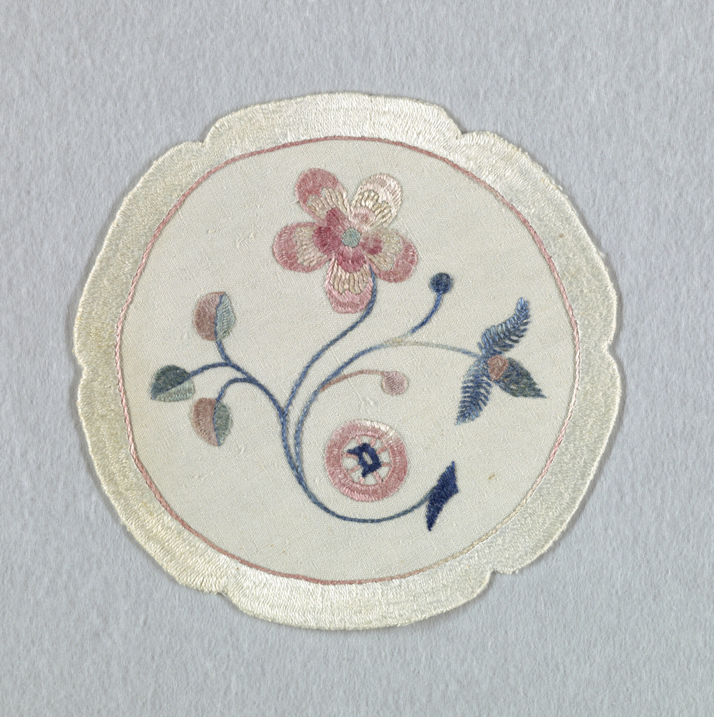This is a Doily. It was manufactured by Deerfield Society of Blue and White Needlework (American, 1896–1926). It is dated ca. 1910 and we acquired it in 1985. Its medium is linen and its technique is stem, roumanian, feather and satin stitches on a plain weave foundation. It is a part of the Textiles department.