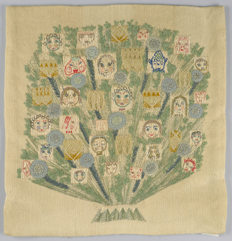 This is a Pillow cover. It was designed by Mariska Karasz and embroidered by Mariska Karasz. It is dated early 1950s and we acquired it in 1985. Its medium is wool and its technique is embroidered in stem, chain, couching and knot stitches on twill weave. It is a part of the Textiles department.