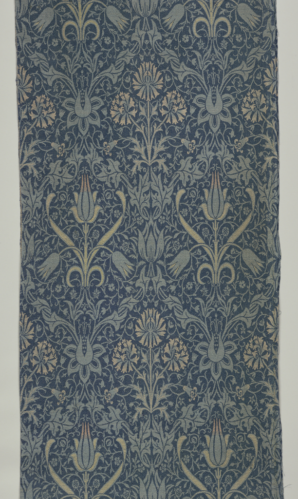 This is a Textile. It was designed by John Henry Dearle and produced by William Morris & Co.. It is dated 1888–89 and we acquired it in 1985. Its medium is wool and its technique is lampas - plain weave foundation (blue warp and weft), plus plain weave pattern (blue warp with light blue weft used throughout plus pale yellow and orange wefts in bands). It is a part of the Textiles department.