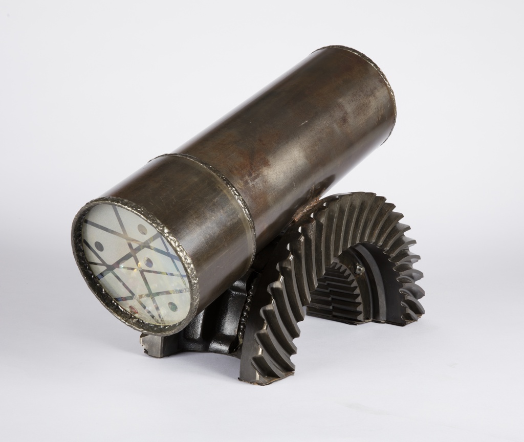 This is a Kaleidoscope. It was designed by Skeeter Demattia and Pete Demattia. It is dated ca. 1986. Its medium is mahogany, cast iron, glass. It is a part of the Product Design and Decorative Arts department.