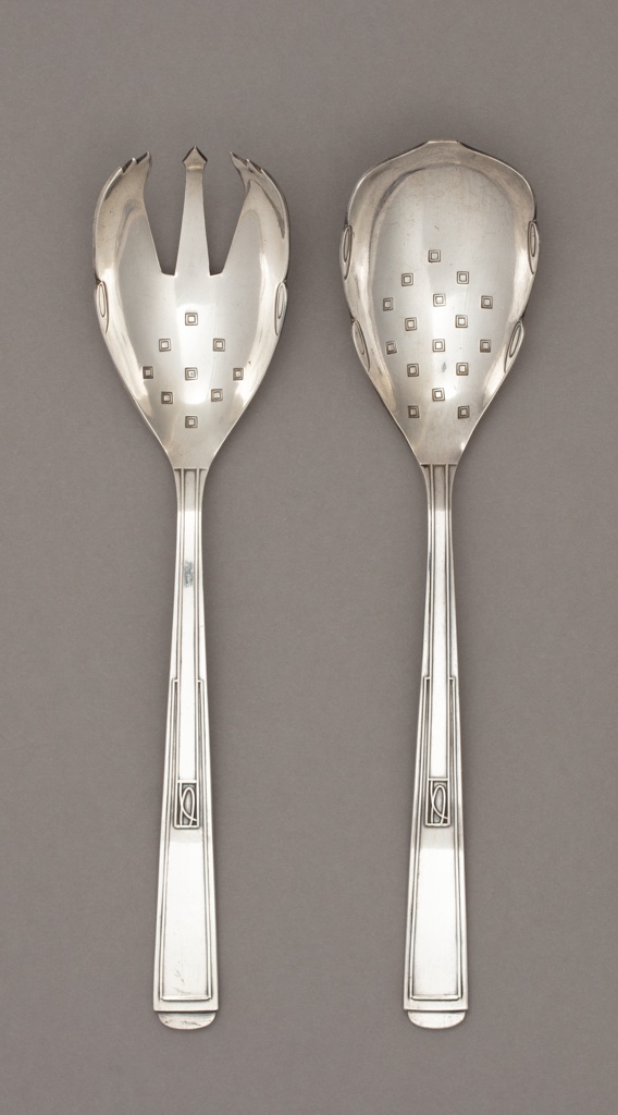Serving Spoon Spoon; Designed by Joseph Maria Olbrich (Austrian, 1867 – 1908); Manufactured by Clarfeld & Springmeyer; metal, silver; L x W x D (spoon): 22.9 × 5.1 × 3.2 cm (9 in. × 2 in. × 1 1/4 in.) L x W x D (fork): 22.5 × 5.1 × 3.2 cm (8 7/8 in. × 2 in. × 1 1/4 in.); Gift of Andrew Van Styn from the estate of Don Magner; 2019-28-158