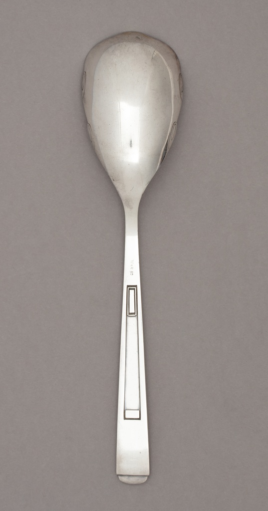 Serving Spoon Spoon; Designed by Joseph Maria Olbrich (Austrian, 1867 – 1908); Manufactured by Clarfeld & Springmeyer; metal, silver; L x W x D (spoon): 22.9 × 5.1 × 3.2 cm (9 in. × 2 in. × 1 1/4 in.) L x W x D (fork): 22.5 × 5.1 × 3.2 cm (8 7/8 in. × 2 in. × 1 1/4 in.); Gift of Andrew Van Styn from the estate of Don Magner; 2019-28-158