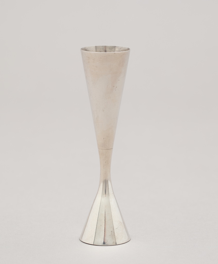 This is a decanter and cordial set. It was designed by Donald Colflesh and manufactured by Gorham Manufacturing Company. It is dated 1960 and we acquired it in 2020. Its medium is sterling silver, rubber, plastic, steel. It is a part of the Product Design and Decorative Arts department.