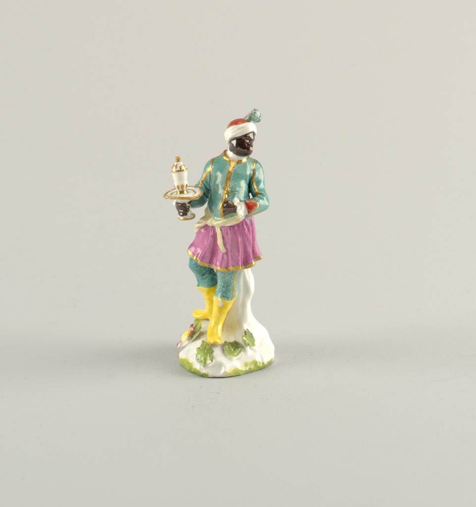 "Blackamoor" Figure of a Servant Figure; Manufactured by Meissen Porcelain Manufactory (Germany); Modeled by Johann Joachim Kändler (German, 1706–1775); hard paste porcelain, vitreous enamel, gold; H x W x D: 14 × 5.7 × 5.5 cm (5 1/2 × 2 1/4 × 2 3/16 in.); Gift of the Estate of James Hazen Hyde; 1960-1-39-b