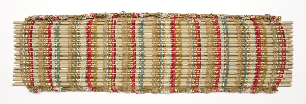 Sample For A Room Divider; Designed by Dorothy Wright Liebes (American, 1897–1972); cotton, viscose rayon, silk-viscose rayon blend, silk, cellulose acetate butyrate-laminated aluminum yarn, wood; H x W: 39 × 127.6 cm (15 3/8 × 50 1/4 in.); Gift of Titi Halle; 2021-15-30
