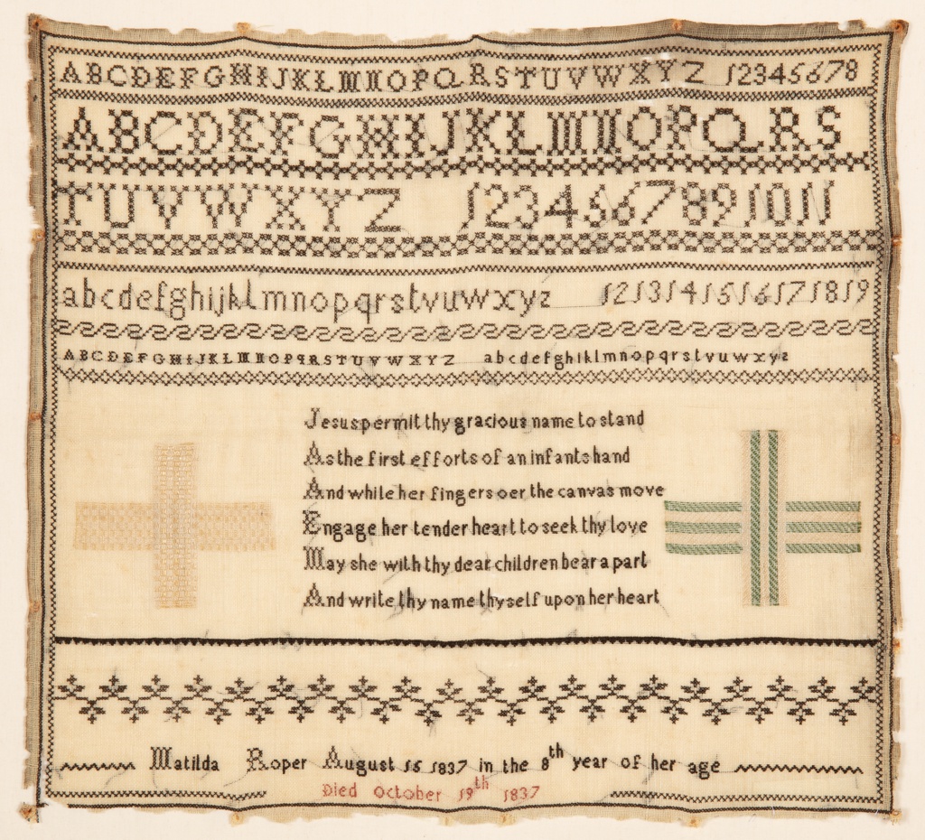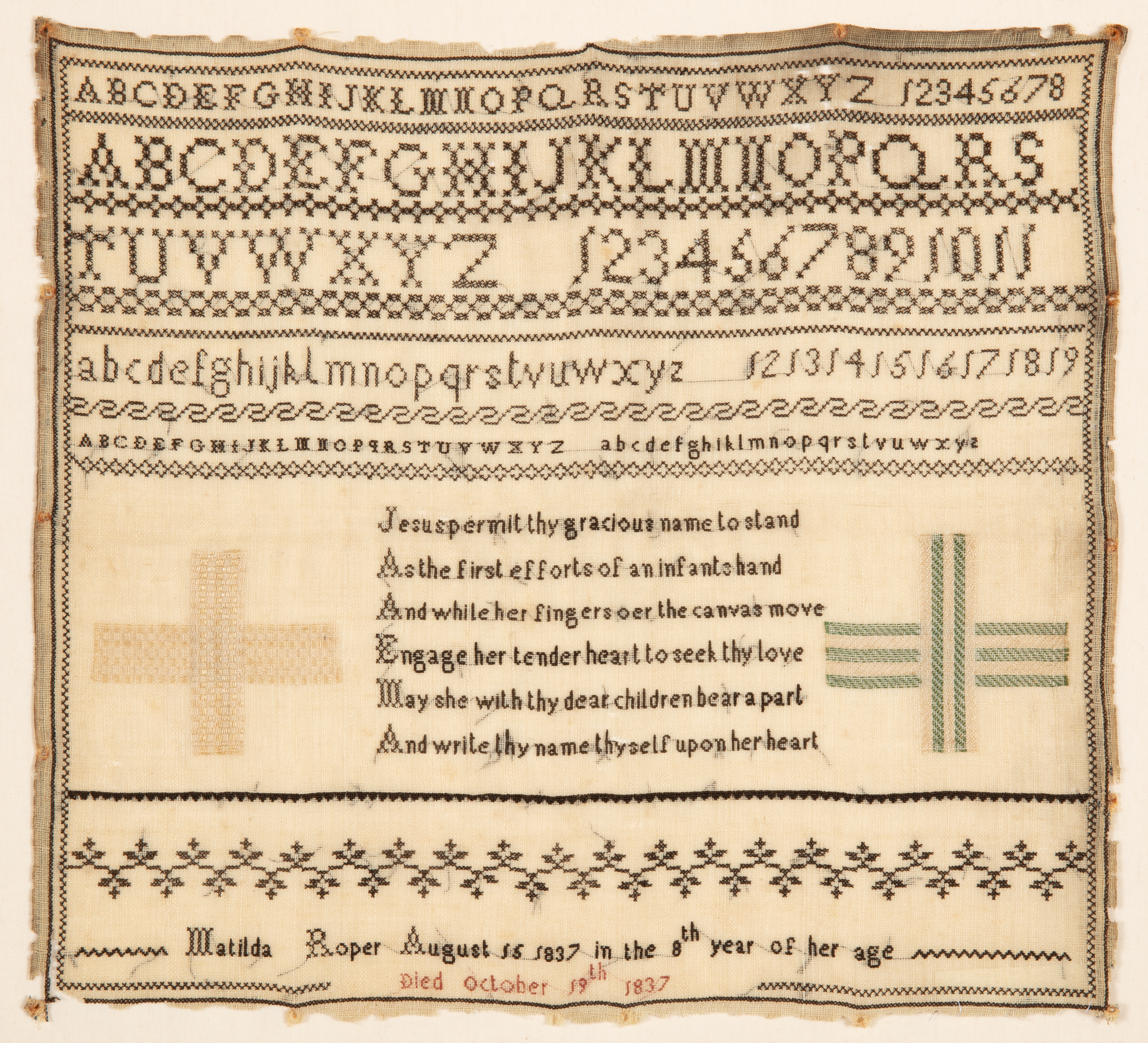 This is a Sampler. It was embroidered by Matilda Roper. It is dated 1837 and we acquired it in 2022. Its medium is silk, cotton, wool. It is a part of the Textiles department.