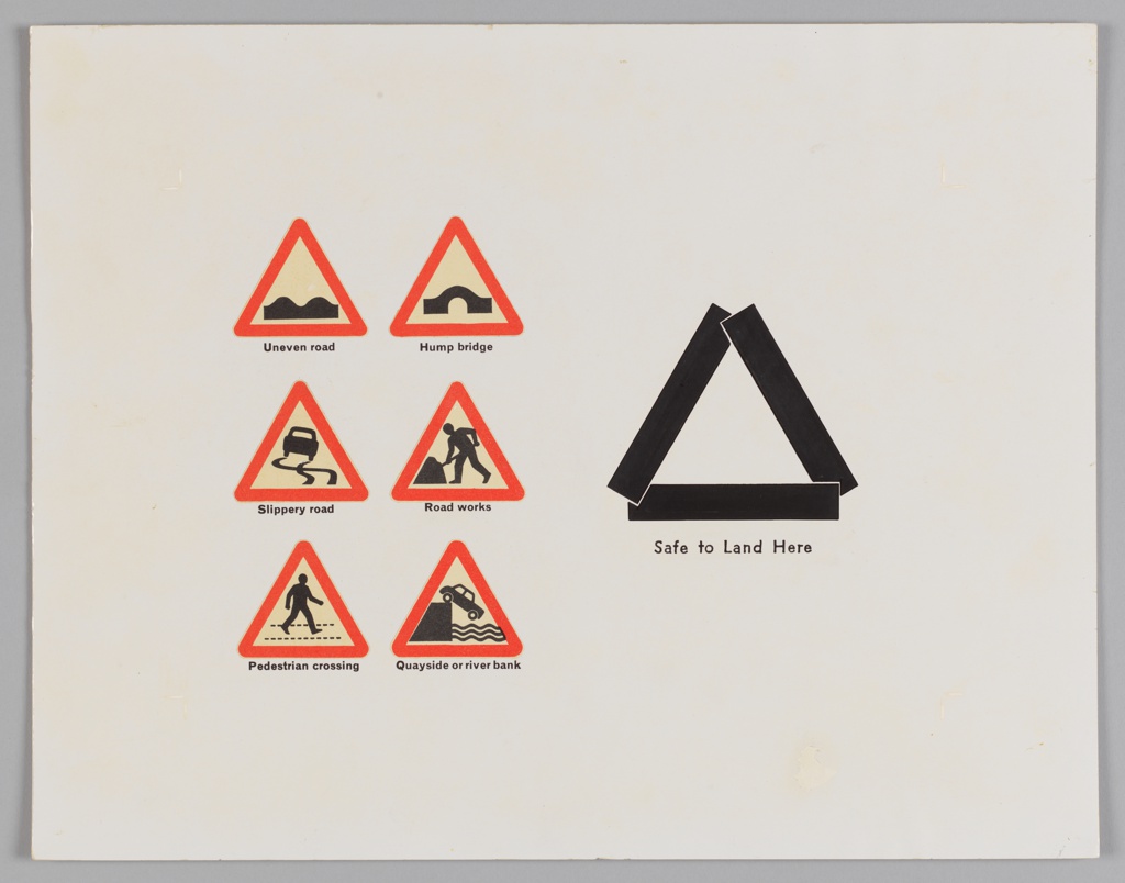 Poster, Triangular Traffic Signals and Ground to Air Emergency Code; Designed by Henry Dreyfuss Associates (United States); collage and photomechanical print on illustration board ; H x W: 28.6 × 35.6 cm (11 in. × 14 in.); Gift of Henry Dreyfuss; 1972-88-1-36