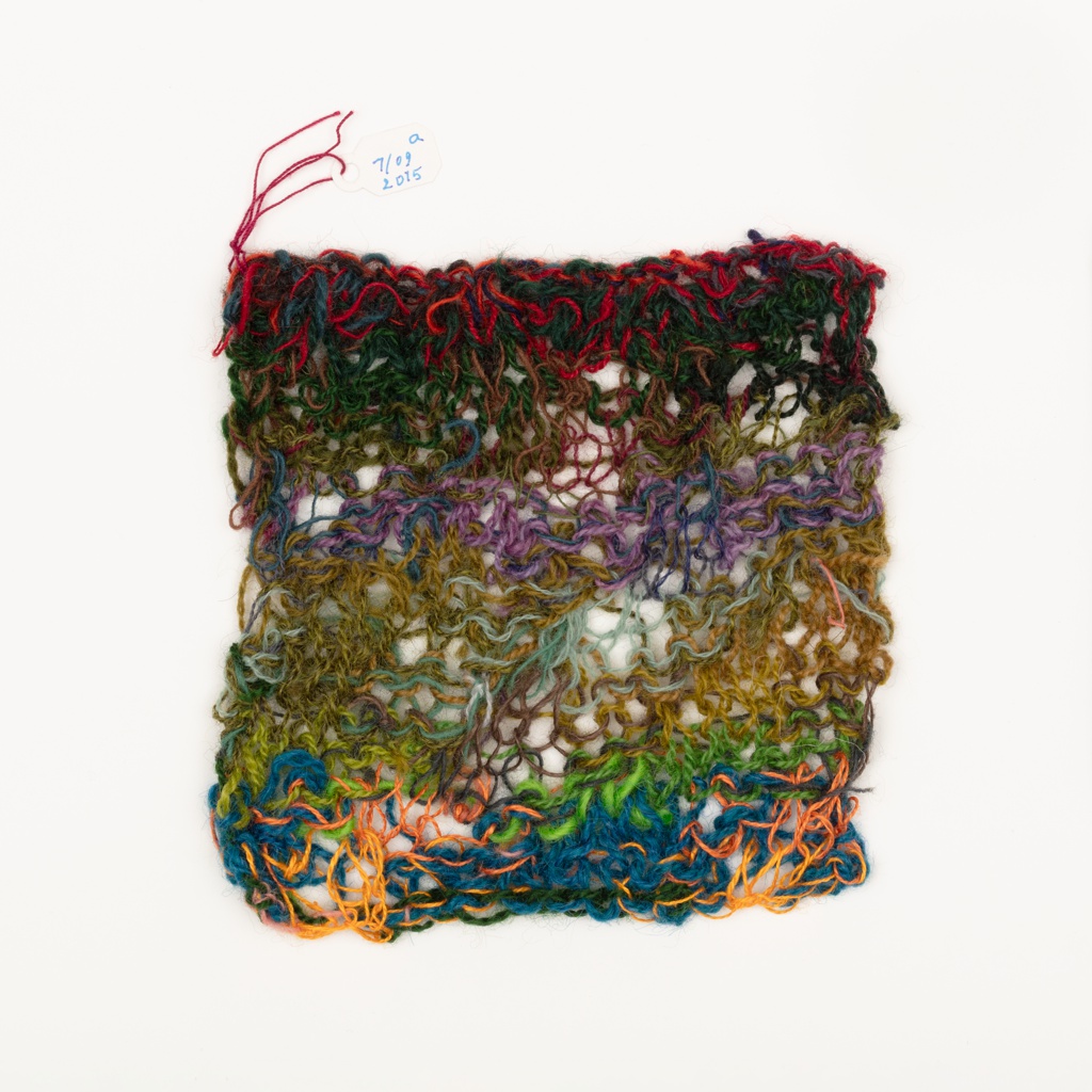 This is a Patch. It was created by Helena Hernmarck. It is dated July 9, 2015 and we acquired it in 2024. Its medium is knitted wool. It is a part of the Textiles department.