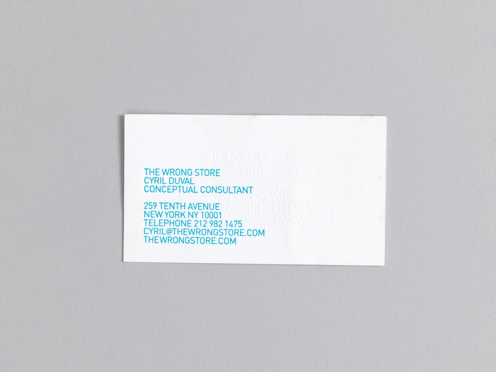Business Card, The Wrong Store Business Card; Designed by Tobias Wong (1974–2010); offset printed (?) in blue ink on white cardstock; H x W: 5.1 × 8.9 cm (2 in. × 3 1/2 in.); The Tobias Wong Collection, Gift of Phyllis Chan and Gordon Wong; 2024-4-30