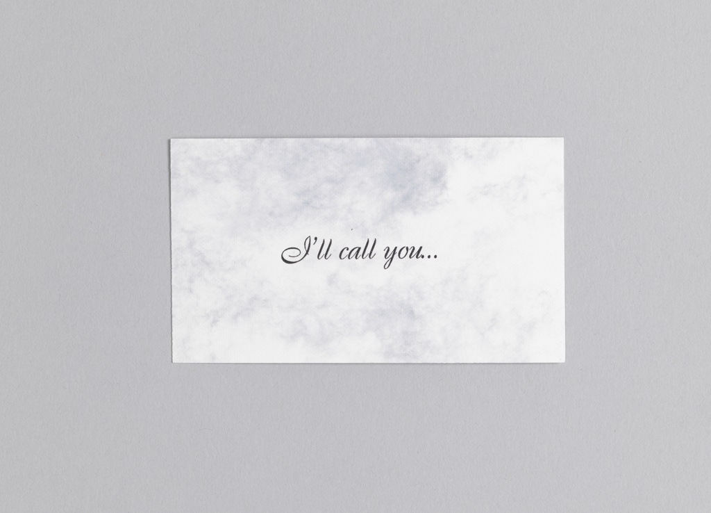 Business Cards, I'll Call You Business Cards; Designed by Tobias Wong (1974–2010); grey and white marbled cardstock; H x W: 5.1 × 8.9 cm (2 in. × 3 1/2 in.); The Tobias Wong Collection, Gift of Phyllis Chan and Gordon Wong; 2024-4-54-a/j