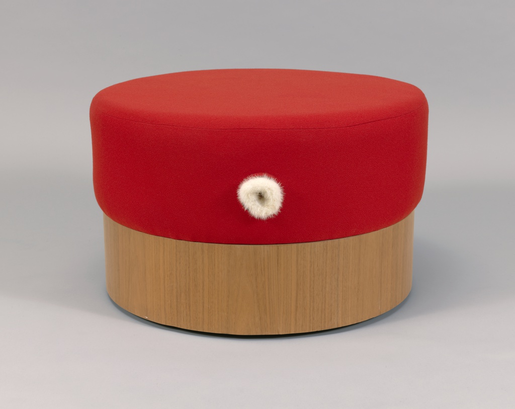Fucking Ottoman Ottoman; Designed by Tobias Wong (1974–2010); Collaborator: Scrapile; bamboo, upholstery, nylon, metal, mink fur, vibrator with electronic components, three magazines; H x diam. (overall): 39 × 63.5 cm (15 3/8 in. × 25 in.); The Tobias Wong Collection, Gift of Phyllis Chan and Gordon Wong; 2024-4-17-a/d