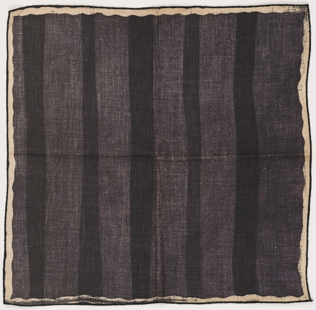 This is a Tablecloth and napkins. It was designed by D.D. Tillett and Leslie Tillett. It is dated 1950–1959 and we acquired it in 2015. Its medium is linen and its technique is plain weave, wax-resist applied with silk screen, hand-pulled stripes applied with drag box. It is a part of the Textiles department.