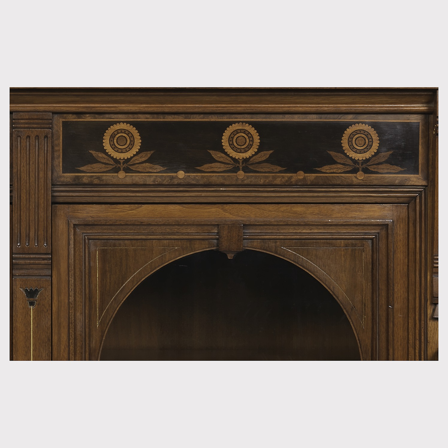 This tripartite inlaid bookcase cabinet was produced by the Herter Brothers, the most important 19th-century American Aesthetic Movement furniture maker. The cabinet shows the influence of the English Reform Movement architect Bruce Talbert in its ornamentation and intentionally chaste rectilinear form. The ornamentation includes marquetry motifs derived from sunflowers, a favorite symbol of both the British Aesthetic Movement and the Herter Brothers. The quality of the inlays is superb, a specialty of Herter Brothers that led to their being one of the first—if not the first—American furniture makers to have a following abroad. Herter Brothers pieces were exported to Britain at the time they were made, which raises an extremely interesting issue of the possible reciprocal influences between their work and those of their British contemporaries.