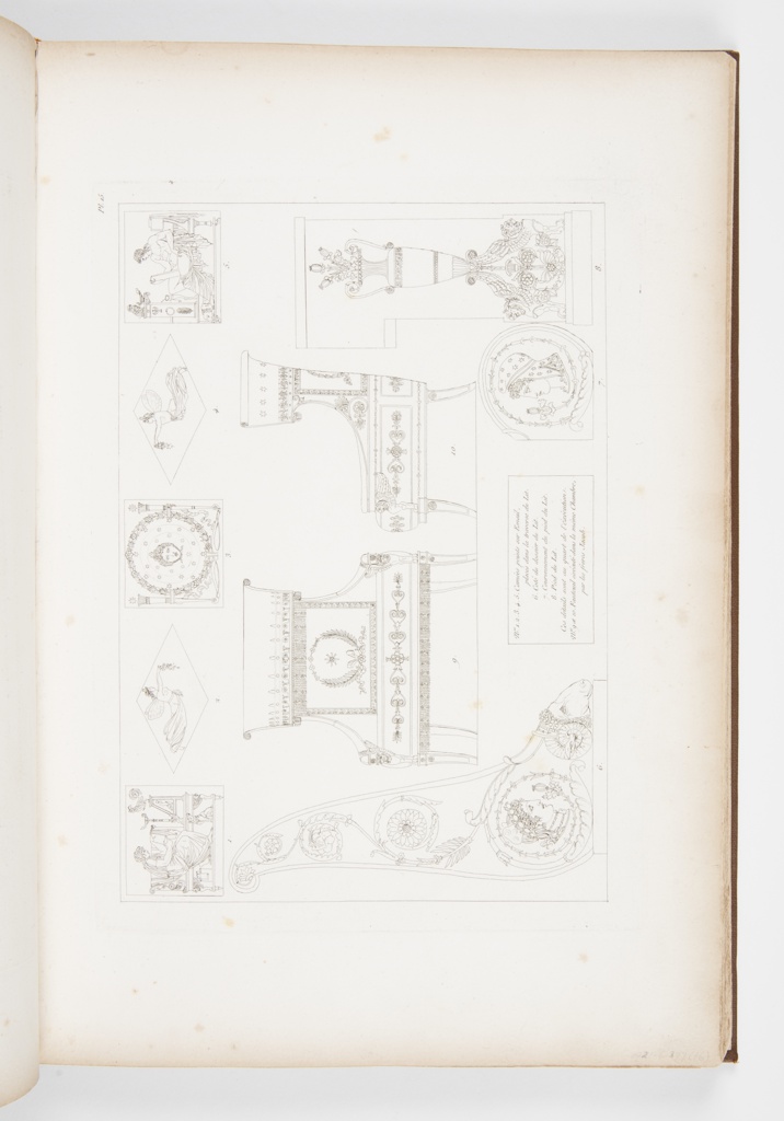 Book, Print, Recueil de decorations intérieures comprenant tout ce qui a rapport a l'ornement; Designed by Charles Percier (French, 1764–1838), Pierre-François-Léonard Fontaine (French, 1762–1853); Published by P. Didot l'aîné (French); etching on cream wove paper; Open: 13 x 57.5 x 45.6 cm (5 1/8 x 22 5/8 x 17 15/16 in.) Overall: 22.9 x 66 x 55.9 cm (9 x 26 x 22 in.) Sheet: 43.8 x 28.8 cm (17 1/4 x 11 5/16 in.); Purchased for the Museum by the Advisory Council; 1921-6-377