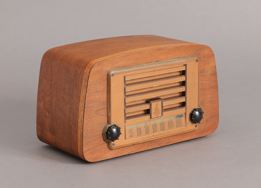 This is a radio. It was designed by Charles Eames and Ray Kaiser Eames and manufactured by Emerson Radio and Phonograph Corp.. It is dated 1940–49 and we acquired it in 2016. Its medium is bentwood, plastic. It is a part of the Product Design and Decorative Arts department.