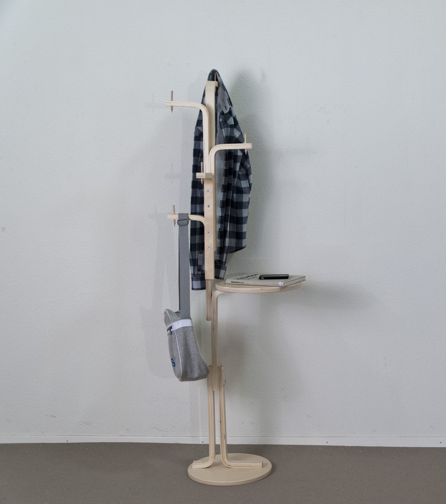 This is a Coat rack. It was designed by Andreas Bhend and produced by Andreas Bhend. It is dated 2012. Its medium is two ikea frosta stools (birch plywood, hardware).