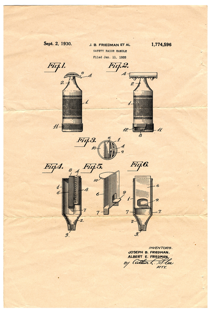 This is a Copy of patent for safety razor handle. It was made by Joseph B. Friedman. It is dated September 2, 1930. Its medium is ink on paper.