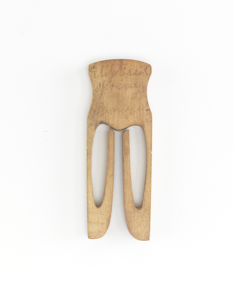 The earliest American patent for a clothespin was granted in 1832, though designs for hanging one’s laundry were likely known in England before then. In 1853, Vermont inventor David M. Smith patented a groundbreaking version of the device that employed two hinged arms, a design that more closely resembles today’s clothespin. These patent models represent some of the 146 patents issued for clothespins between the years 1852 and 1887. Most have been largely forgotten as a product of shortsighted ingenuity, but this collection nonetheless sheds light on the patent frenzy of the late 19th-century. Most patented clothespins in this period were for minor improvements, and almost all share a common goal: to keep clothes on the drying line without falling off. Some, including a later version patented by Smith in 1867, propose alternative materials for existing designs (in this case, substituting the wire for a cheaper wooden joint). Others dispense with a joint altogether in favor of a cut wood model, like the easily portable version patented by Henry Mellish in 1871. Today, an estimated 60 percent of all American homes have an automatic clothes dryer, rendering the clothespin more or less obsolete—except in the case of children’s craft projects. Indeed, Vermont’s National Clothespin Factory, the last factory producing wooden clothespins in the United States, closed its doors in 2002.