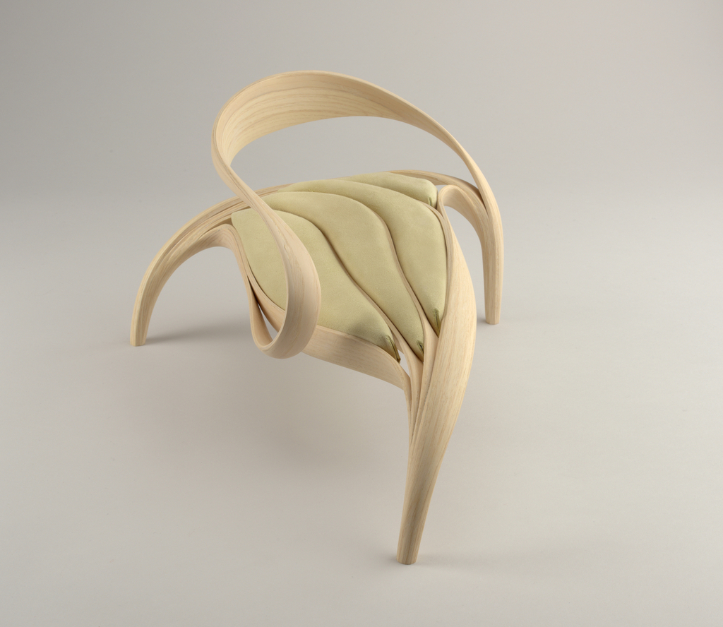 This is a Chair model (two seater). It was made by Joseph Walsh Studio. It is dated 2014 and we acquired it in 2015. Its medium is bent layered ash wood strips, suede upholstery. It is a part of the Product Design and Decorative Arts department.