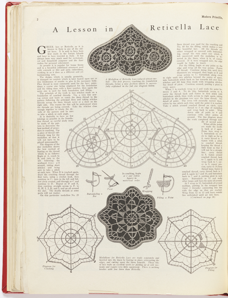 Modern Priscilla began as a 16-page publication devoted to fancy work, dress patterns, china painting, and needlework in general, at 50cents a year. It eventually enlarged in scope to cover many other aspects of women's home life. Cooking, health and beauty tips, fashion, short stories, and home decorating became popular features, but patterns for needlework of all kinds were constant highlights. The Modern Priscilla documents the home economics movement of the late 19th and early 20th century, which encouraged women to pursue homemaking as a profession vital to humanity’s continued progress. A Lesson in Reticella Lace not only speaks to homemaking but, with the lovely intricacies of the lace, connects the art of needlework with beautifying the home and creating fashionable attire for the family.
