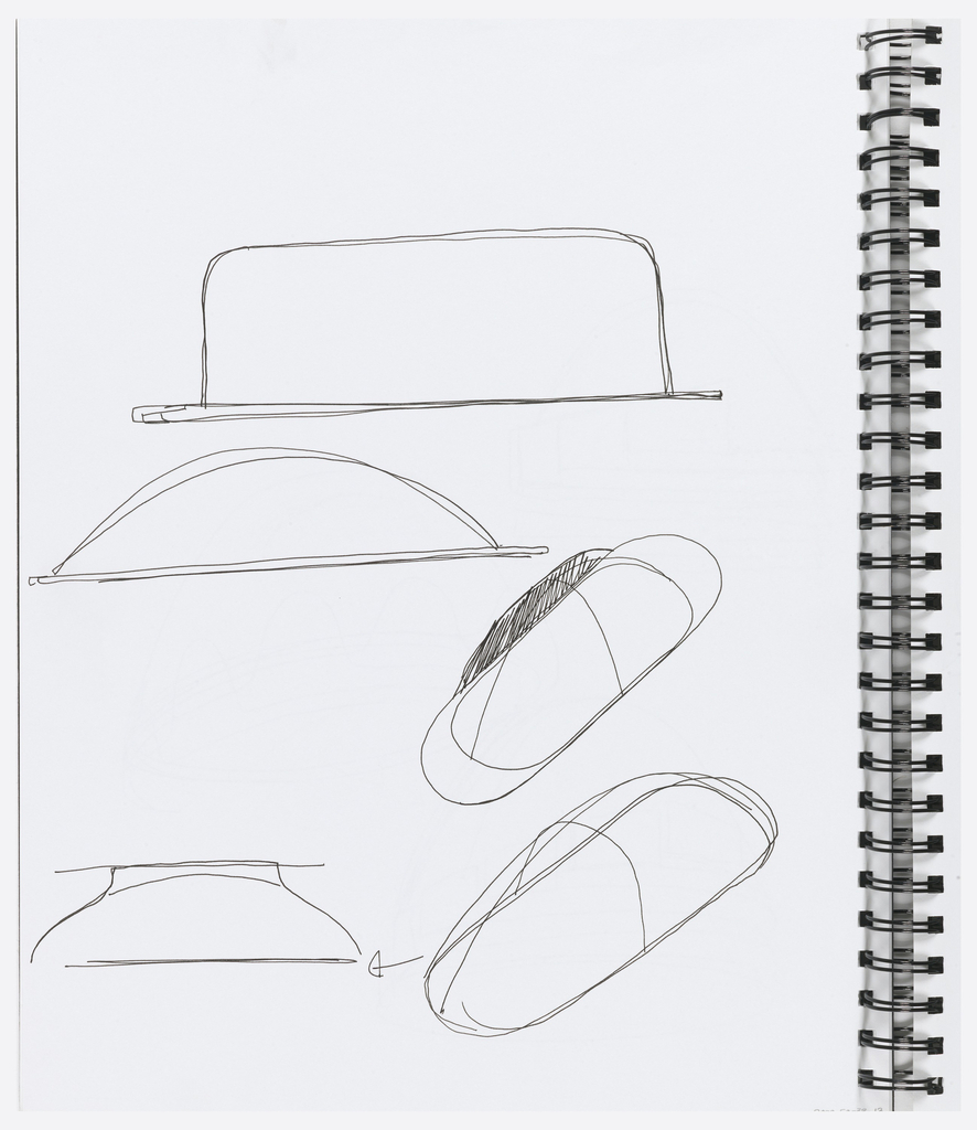 Sketchbook, Sketchbook with Designs for Tableware, Music Equipment and Other Products, 1998; Designed by Karim Rashid (Canadian, b. Egypt, 1960); ring-bound black cardboard with 17 white paper pages; rollerball pen in black ink; 35.6 x 27.9 x 0.8 cm (14 x 11 x 5/16 in. ); Gift of Karim Rashid; 2000-50-33-12