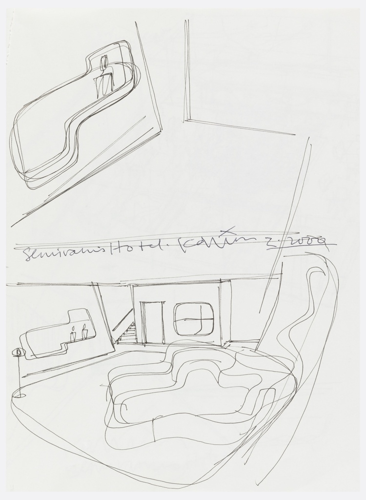 Sketchbook, Page 6, Sketchbook with Designs for Semiramis Hotel, Athens, Greece and Other Objects; Designed by Karim Rashid (Canadian, b. Egypt, 1960); ring-bound sketchbook with black cover and 15 leaves, rollerball pen in black ink on white paper; 35.6 x 27.9 x 0.8 cm (14 x 11 x 5/16 in. ); Gift of Karim Rashid; 2000-50-34-6