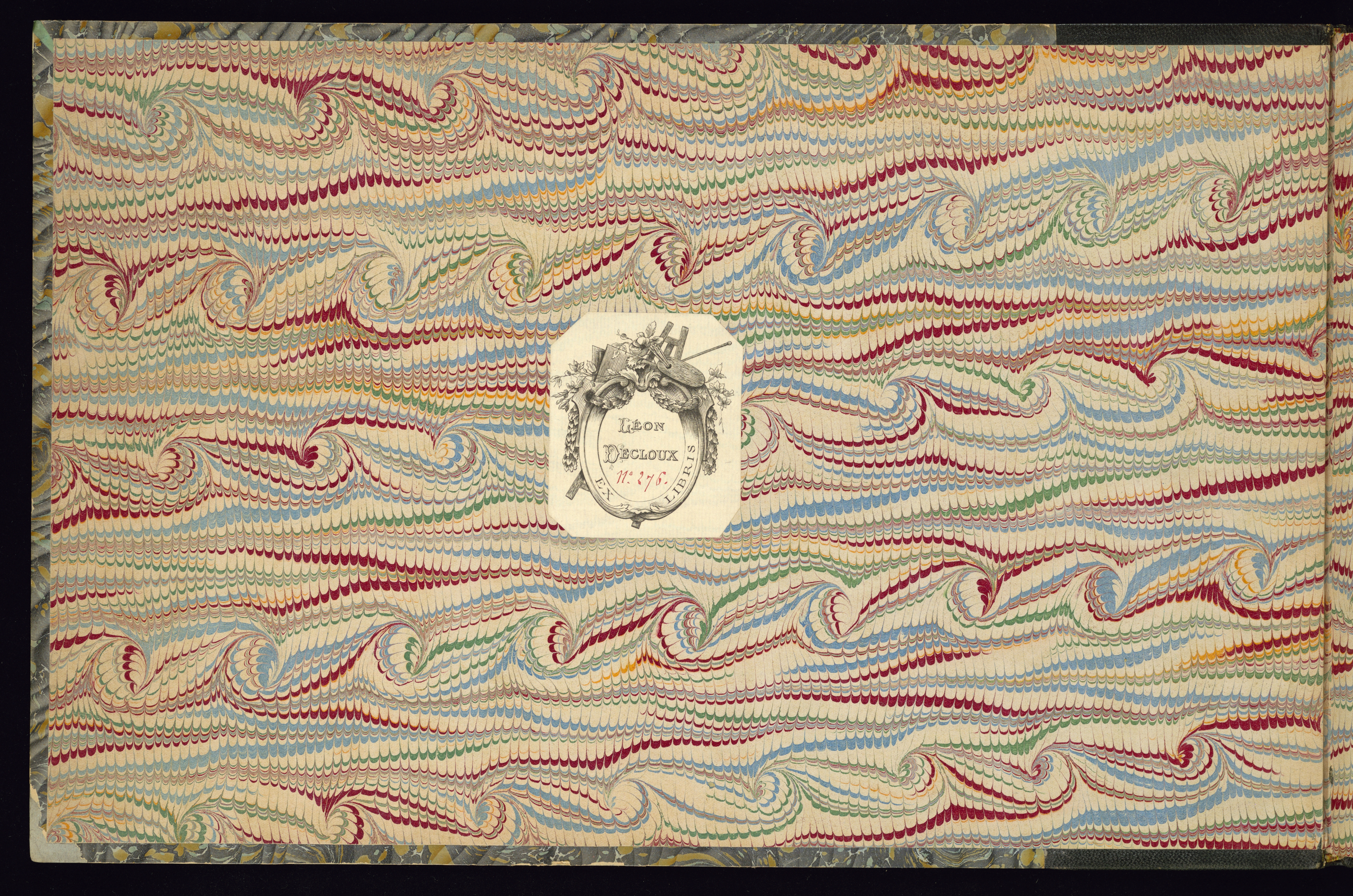 Léon Decloux ex-libris pasted onto center of upper cover pastedown; watermarks on flyleafs: 'J.A' or 'A.L' within an oval; watermarks on flyleafs: INGRES FRANCE