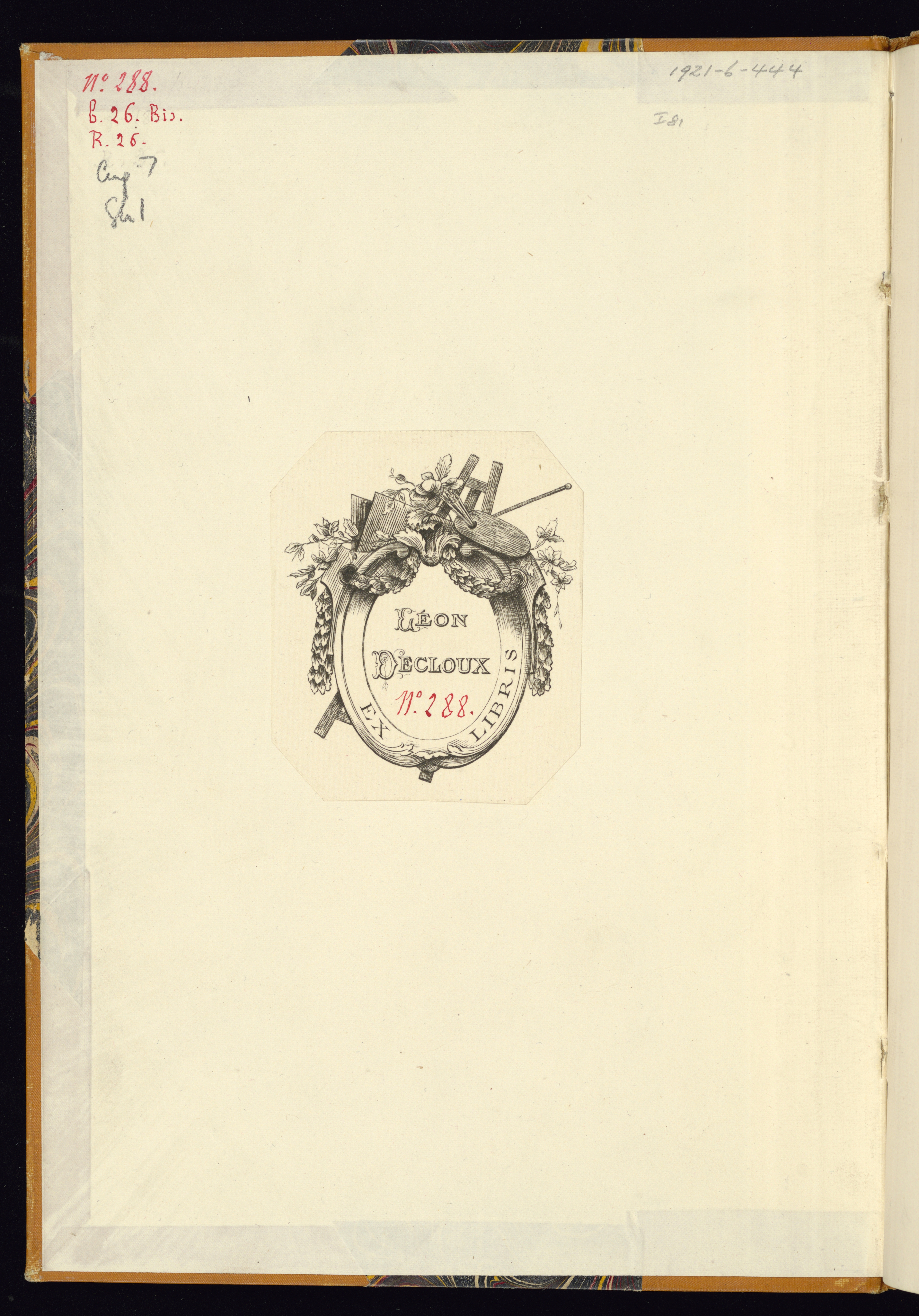 Inscribed in red ink in center of Léon Decloux Ex Libris, center of upper cover pastedown: No. 288
