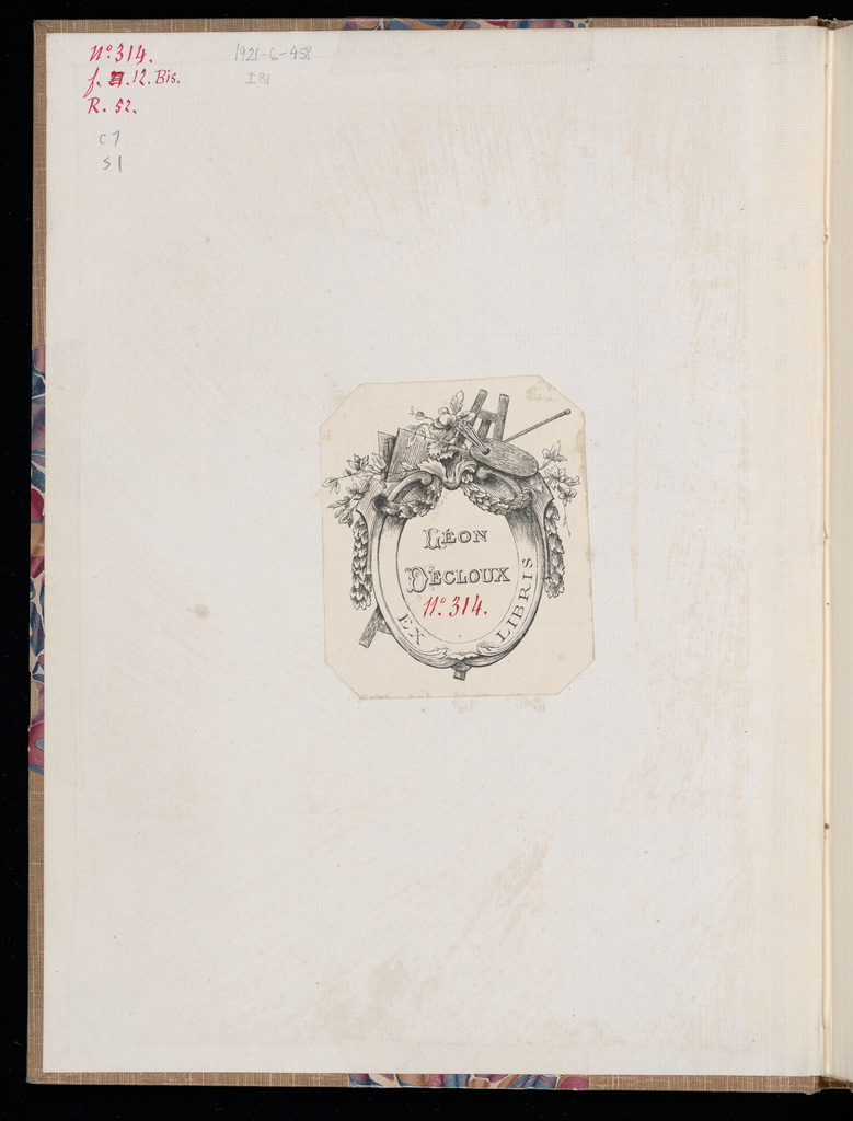 In upper left in red ink: No. 314. / f. 12. Bis. / R. 52.; Inscriped in graphite in upper left, below red markings: c7 / S1; Inscribed in graphite in upper left, to the right of the red ink: 1921-6-458 / I81; Inscribed in red ink in the middle of printed ex libris: No. 314.