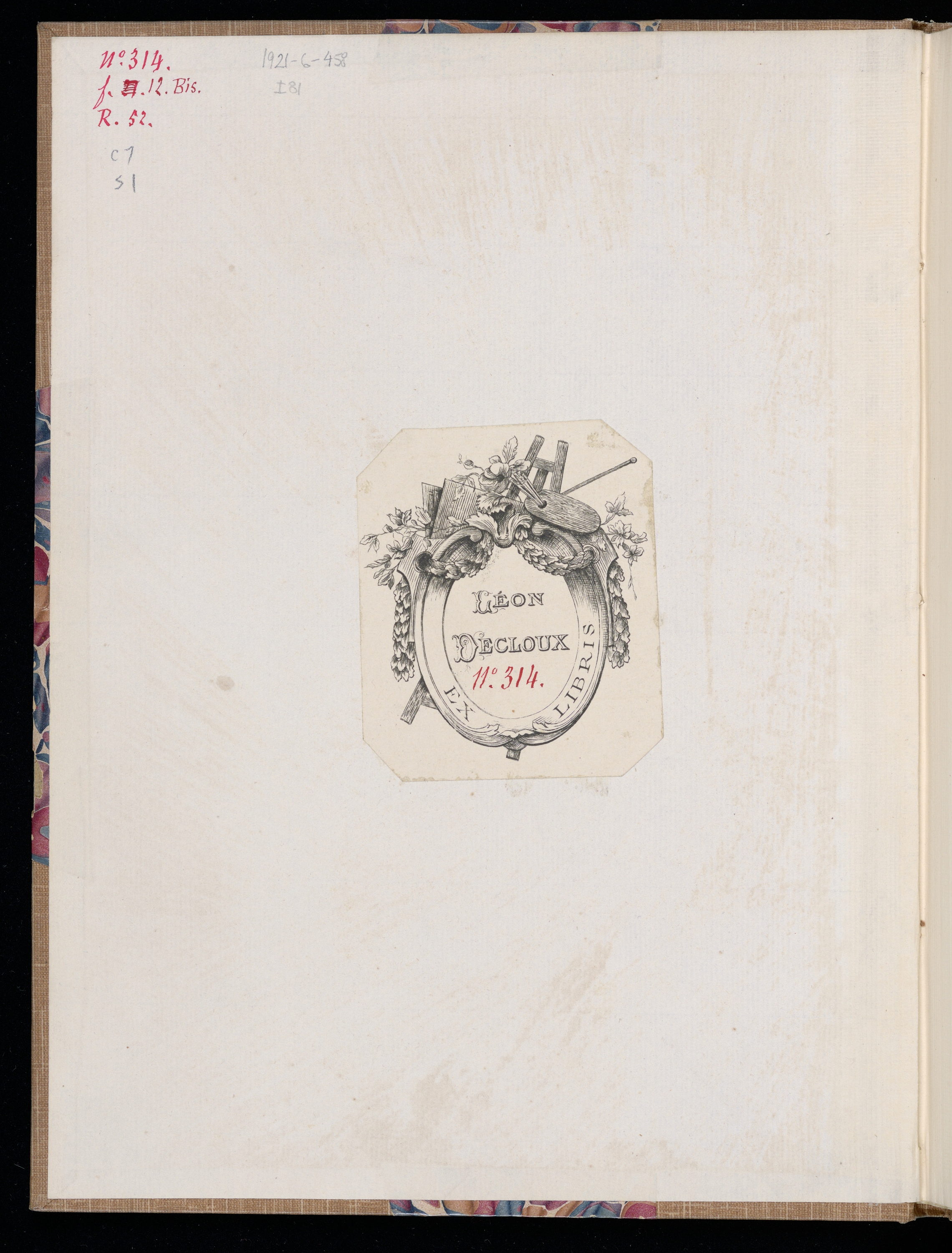 Léon Decloux Ex Libris, printed on paper, pasted to the middle of the paste down endpaper of the upper cover.
