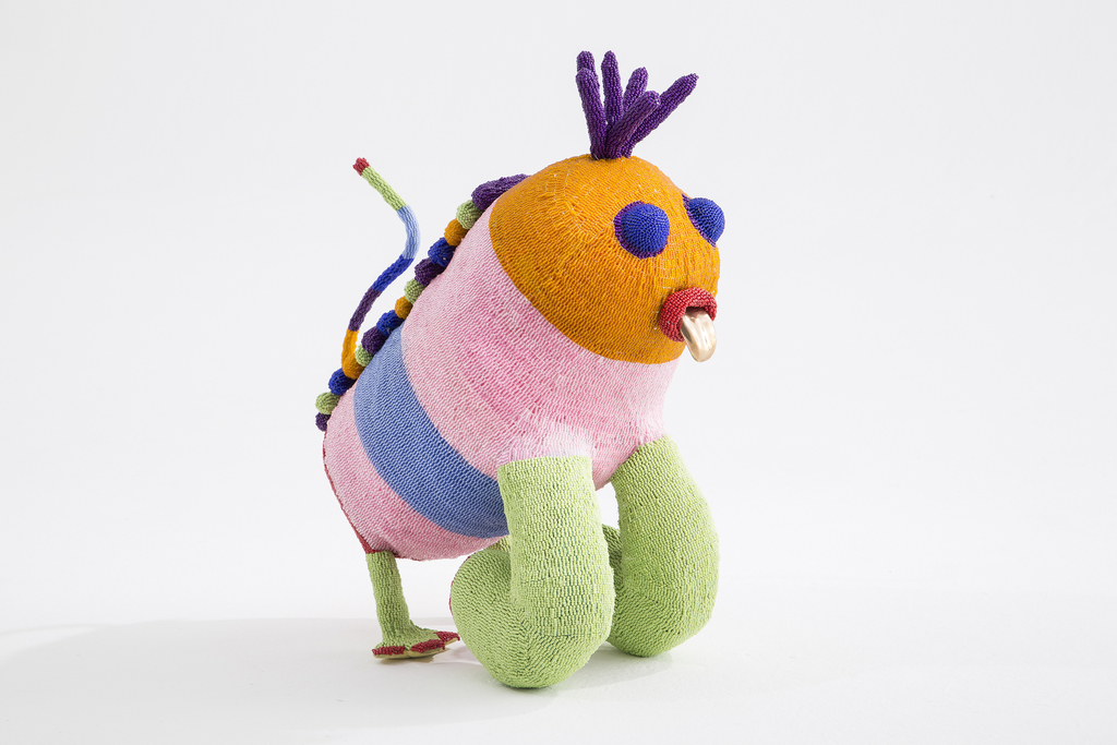 This plump, insect-like critter seems ready to play. This sculpture is from Afreaks, a series of objects that utilize the hyperbolic geometric patterns that govern such natural phenomena as coral formations. The beads are assembled by women from the Khayelitsha settlement outside of Cape Town, South Africa. Known as The Haas Sisters, they collaborate with The Haas Brothers on the realization of these remarkable pieces.