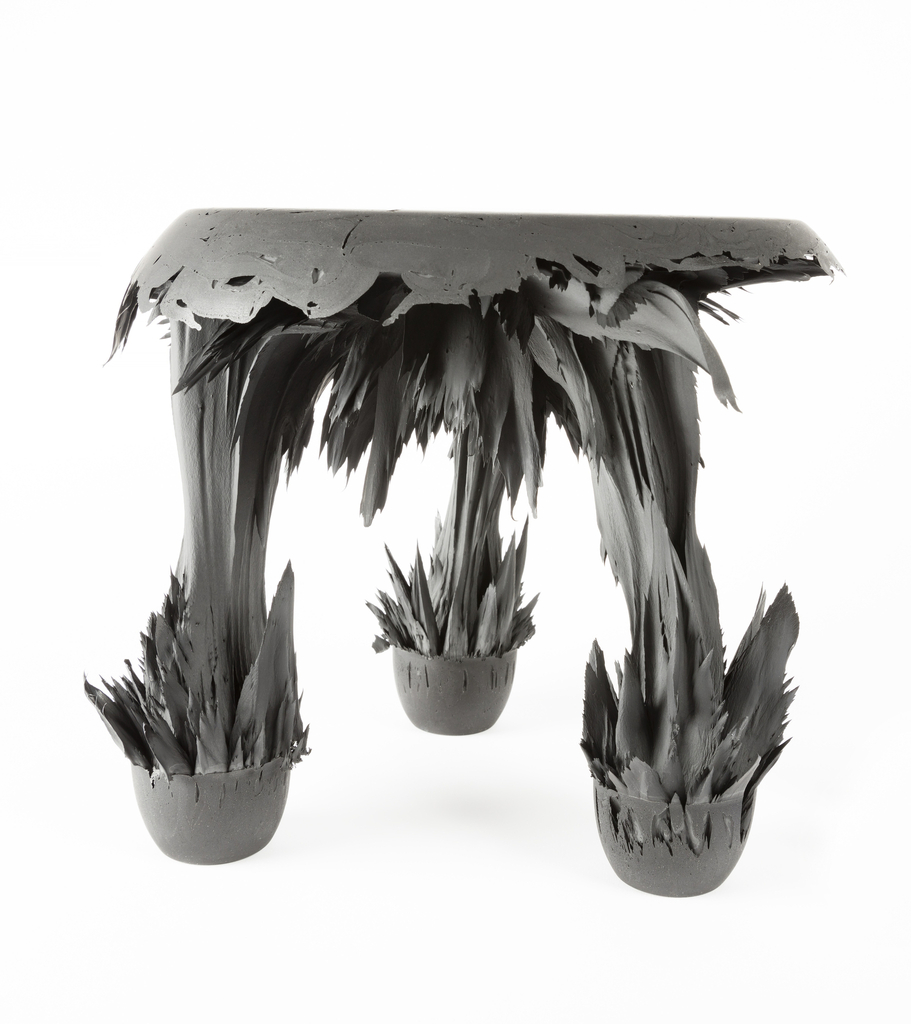 Van der Wiel explores the impact of natural forces on physical materials. Van der Wiel developed and built his own gravity machine, a tool that uses oppositional forces of gravity and magnetism to generate organic, armored forms made from a composite material of iron filings and plastic or ceramic. With the machine, van der Wiel creates tables, stools, and fantastical architectural that sprout stalactites.