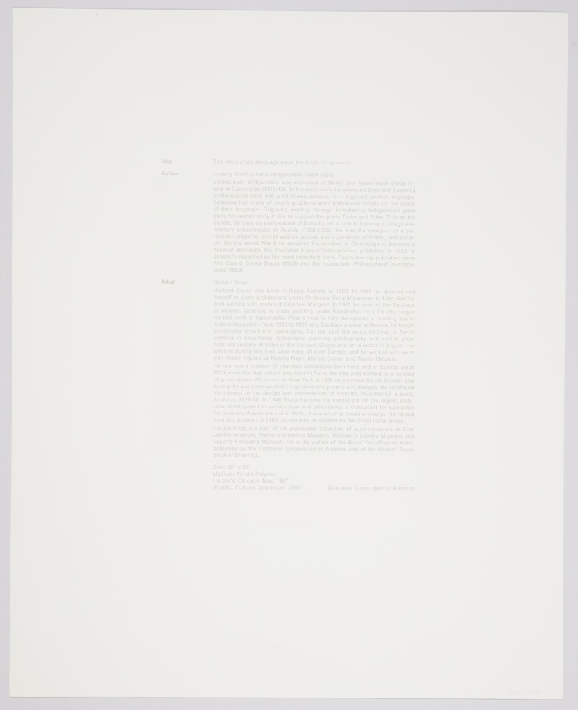 Print, Great Ideas of Western Man Featuring Ludwig Wittgenstein; Designed by Herbert Bayer (American, b. Austria, active Germany and USA, 1900–1985); Client: Container Corporation of America (United States); offset lithograph on glossy white paper; 35.8 × 28.9 cm (14 1/8 × 11 3/8 in.); Museum purchase with funding provided by the Buddy Taub Foundation, Dennis A. Roach and Jill Roach Directors; 2016-54-19
