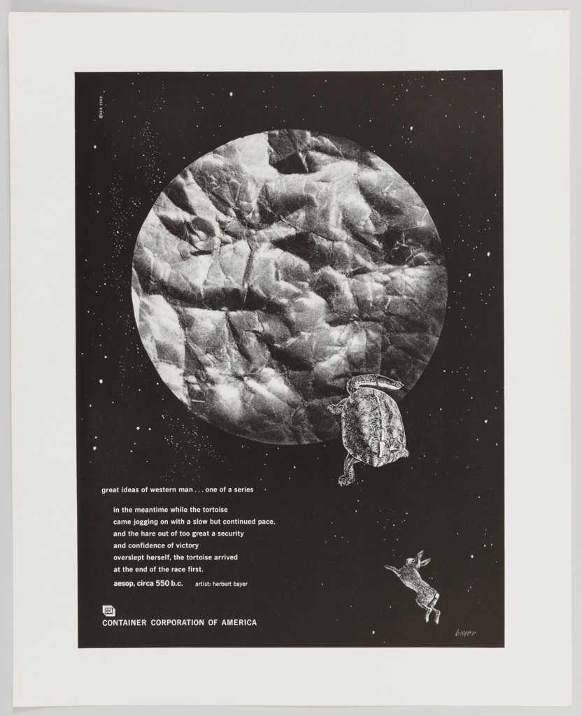 Print, Great Ideas of Western Man Featuring Aesop; Designed by Herbert Bayer (American, b. Austria, active Germany and USA, 1900–1985); Client: Container Corporation of America (United States); offset lithograph on glossy white paper; 35.9 × 28.9 cm (14 1/8 × 11 3/8 in.); Museum purchase with funding provided by the Buddy Taub Foundation, Dennis A. Roach and Jill Roach Directors; 2016-54-28