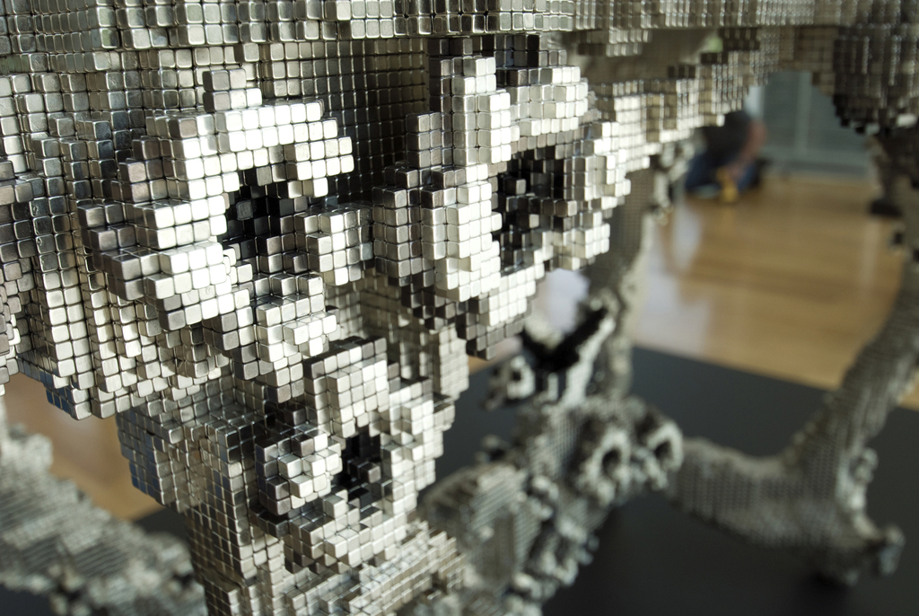 The Megavoxel table is made from 5-millimeter voxel cubes, making it look more resolved and less blocky than the Kilovoxel table.