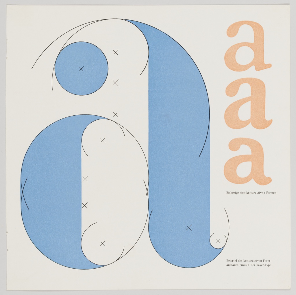 Printed in black ink, center right: Bisherige nichtkonstruktive a-Formen; lower right: Beispiel des konstruktiven Form- / aufbaues eines a der bayer-Type; Inscribed in graphite, verso, upper left: BOOKLET BAYER TYPE – 1933; upper right: Bayer 45